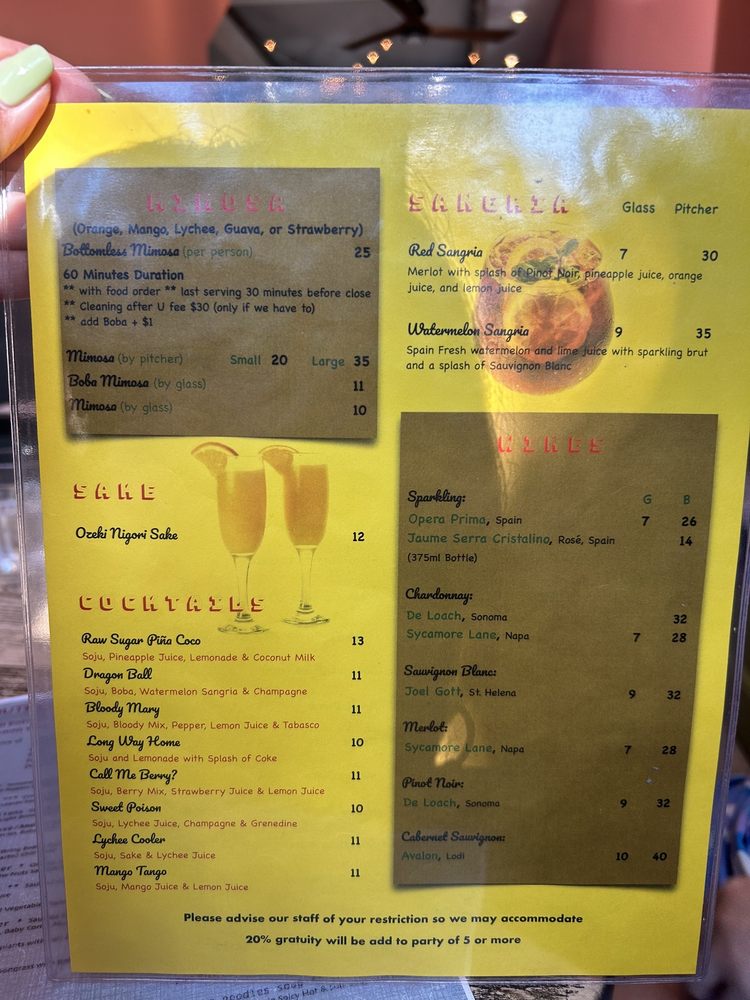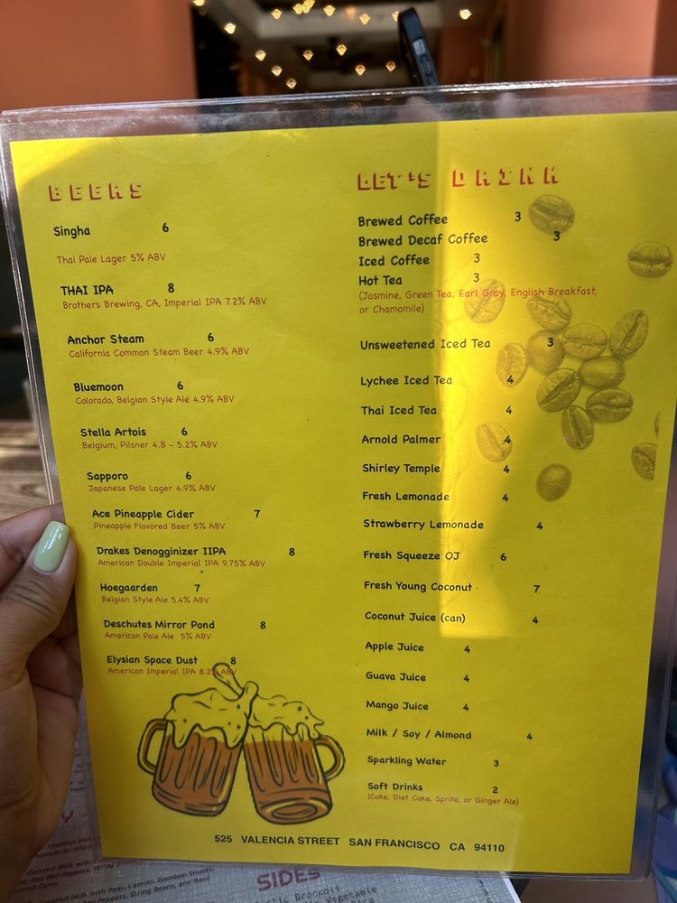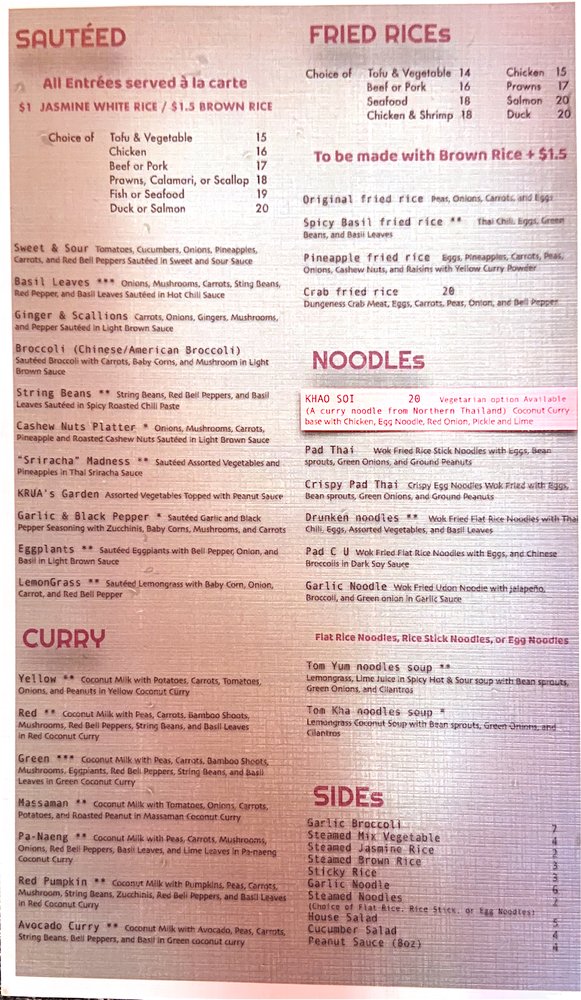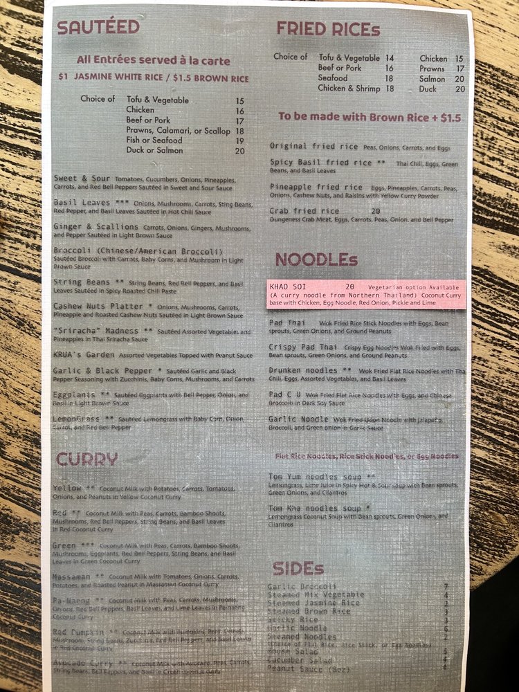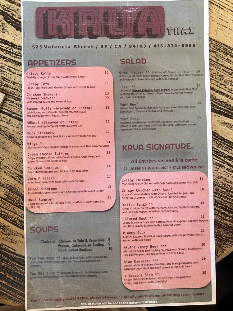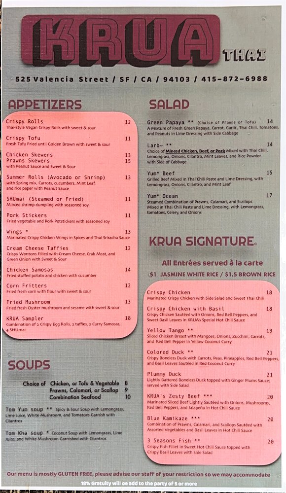 KRUA Thai, located in San Francisco, offers a diverse menu with options for vegan, gluten-free, and meat-lovers alike. From appetizers like crispy egg rolls to flavorful soups like the Tom Yum and Tom Kha, there's something for everyone. The Green Papaya Salad and Larb Salad are must-tries for those looking for a burst of Thai flavors. Customers rave about the Pad Thai and Khao Soi, praising the generous portion sizes and authentic taste. The restaurant also offers catering and delivery services, making it convenient for all occasions. With a casual and welcoming atmosphere, KRUA Thai is the perfect spot for a delicious and satisfying Thai meal in the Mission district.